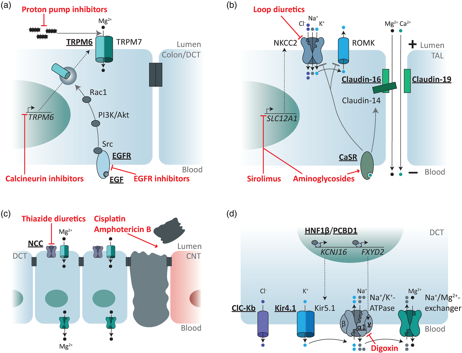 Magnesium (Mg2+) plays an essential role in many biological processes. Mg2+ deficiency is therefore associated with a wide range of clinical effects including muscle cramps, fatigue, seizures and arrhythmias. To maintain sufficient Mg2+ levels, (re)absorption of Mg2+ in the intestine and kidney is tightly regulated. Genetic defects that disturb Mg2+ uptake pathways, as well as drugs interfering with Mg2+ (re)absorption cause hypomagnesemia. The aim of this review is to provide an overview of the molecular mechanisms underlying genetic and drug-induced Mg2+ deficiencies. This leads to the identification of four main mechanisms that are affected by hypomagnesemia-causing mutations or drugs: luminal transient receptor potential melastatin type 6/7-mediated Mg2+ uptake, paracellular Mg2+ reabsorption in the thick ascending limb of Henle’s loop, structural integrity of the distal convoluted tubule and Na+-dependent Mg2+ extrusion driven by the Na+/K+-ATPase. Our analysis demonstrates that genetic and drug-induced causes of hypomagnesemia share common molecular mechanisms. Targeting these shared pathways can lead to novel treatment options for patients with hypomagnesemia.