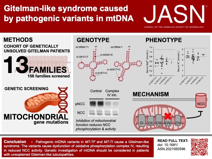 Results: Genetic investigations revealed four mtDNA variants in 13 families: m.591C>T (n=7), m.616T>C (n=1), m.643A>G (n=1) (all in MT-TF), and m.4291T>C (n=4, in MT-TI). Variants were near homoplasmic in affected individuals. All variants were classified as pathogenic, except for m.643A>G, which was classified as a variant of uncertain significance. Importantly, affected members of six families with an MT-TF variant additionally suffered from progressive chronic kidney disease. Dysfunction of oxidative phosphorylation complex IV and reduced maximal mitochondrial respiratory capacity were found in patient fibroblasts. In vitro pharmacological inhibition of complex IV, mimicking the effect of the mtDNA variants, inhibited NCC phosphorylation and NCC-mediated sodium uptake.