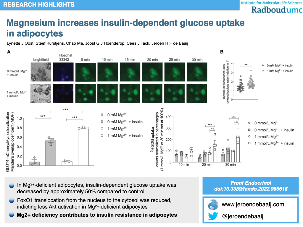 Results: In people with T2D, plasma Mg2+ concentration was inversely associated with markers of insulin resistance; i.e., the lower Mg2+, the more insulin resistant. In Mg2+-deficient adipocytes, insulin-dependent glucose uptake was decreased by approximately 50% compared to control Mg2+condition. Insulin receptor phosphorylation Tyr1150/1151 and PIP3 mass were not decreased in Mg2+-deficient adipocytes. Live imaging microscopy of adipocytes transduced with an Akt sensor (FoxO1-Clover) demonstrated that FoxO1 translocation from the nucleus to the cytosol was reduced, indicting less Akt activation in Mg2+-deficient adipocytes. Immunocytochemistry using a Lectin membrane marker and at the membrane located Myc epitope-tagged glucose transporter 4 (GLUT4) demonstrated that GLUT4 translocation was diminished in insulin-stimulated Mg2+-deficient adipocytes compared to control conditions. Energy metabolism in Mg2+ deficient adipocytes was characterized by decreased glycolysis, upon insulin stimulation.