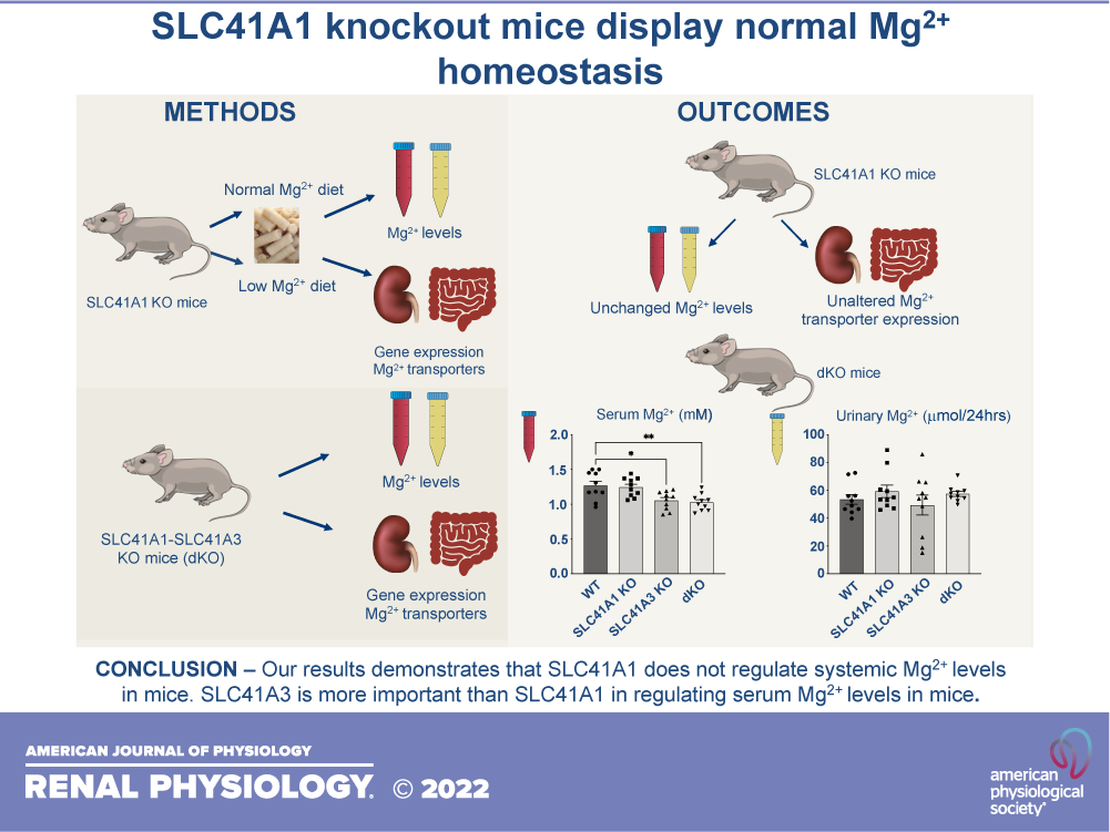 Transcellular Mg2+ reabsorption in the distal convoluted tubule (DCT) of the kidneys plays an important role in maintaining systemic Mg2+ homeostasis. SLC41A1 is a Na+/Mg2+ exchanger that mediates Mg2+ efflux from cells and is hypothesized to facilitate basolateral extrusion of Mg2+ in the DCT. In this study, we generated a SLC41A1 knockout mouse model to examine the role of SLC41A1 in Mg2+ homeostasis. Slc41a1-/- mice exhibited similar serum and urine Mg2+ levels as their wild-type littermates. Dietary restriction of Mg2+ resulted in reduced serum Mg2+ concentration and urinary Mg2+ excretion, which was similar in the wild-type and knockout groups. Expression of genes encoding Mg2+ channels and transporters such as transient receptor potential melastatin 6 (Trpm6), transient receptor potential melastatin 7 (Trpm7), cyclin and CBS domain divalent metal cation transport mediator 2 (Cnnm2), and Slc41a3 were unchanged based on genotype. We investigated the potential redundancy of SLC41A1 and its homolog SLC41A3 by generating a double knockout mouse. Although Slc41a3-/- knockout mice showed significantly reduced serum Mg2+ compared with wild-type and Slc41a1-/- knockout groups, double knockout mice displayed similar serum Mg2+ levels as Slc41a3-/- knockout mice. In conclusion, our data show that SLC41A1 is not involved in the regulation of systemic Mg2+ homeostasis in mice. Our data also demonstrate that SLC41A1 does not compensate for the loss of SLC41A3, suggesting different functions of these SLC41 proteins in vivo.