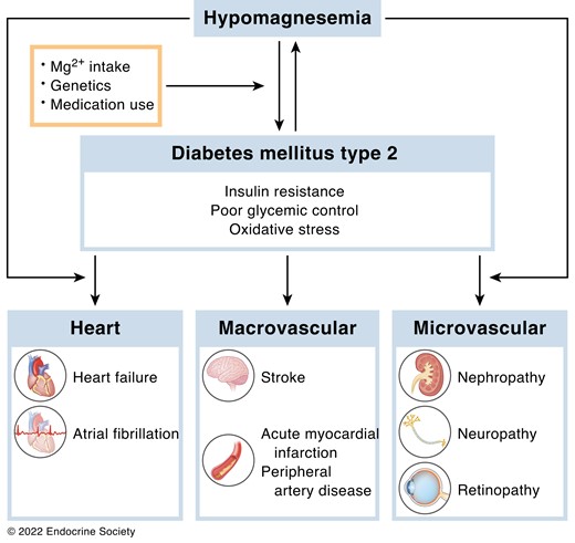 Hypomagnesemia is tenfold more common in individuals with type 2 diabetes (T2D), compared to the healthy population. Factors that are involved in this high prevalence are low Mg2+ intake, gut microbiome composition, medication use and presumably genetics. Hypomagnesemia is associated with insulin resistance, which subsequently increases the risk to develop T2D or deteriorates glycaemic control in existing diabetes. Mg2+ supplementation decreases T2D associated features like dyslipidaemia and inflammation; which are important risk factors for cardiovascular disease (CVD). Epidemiological studies have shown an inverse association between serum Mg2+ and the risk to develop heart failure (HF), atrial fibrillation (AF) and microvascular disease in T2D. The potential protective effect of Mg2+ on HF and AF may be explained by reduced oxidative stress, fibrosis and electrical remodeling in the heart. In microvascular disease, Mg2+ reduces the detrimental effects of hyperglycemia and improves endothelial dysfunction. Though, clinical studies assessing the effect of long-term Mg2+ supplementation on CVD incidents are lacking and gaps remain on how Mg2+ may reduce CVD risk in T2D. Despite the high prevalence of hypomagnesemia in people with T2D, routine screening of Mg2+ deficiency to provide Mg2+ supplementation when needed is not implemented in clinical care as sufficient clinical evidence is lacking. In conclusion, hypomagnesemia is common in people with T2D and is both involved as cause, probably through molecular mechanisms leading to insulin resistance, and consequence and is prospectively associated with development of HF, AF and microvascular complications. Whether long-term supplementation of Mg2+ is beneficial, however, remains to be determined.