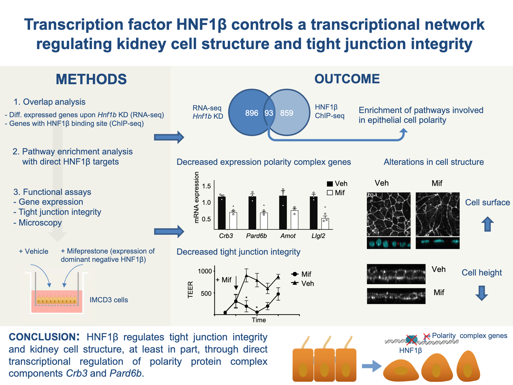 Mutations in the HNF1B gene cause autosomal dominant tubulointerstitial kidney disease (ADTKD)-HNF1β, a rare and heterogenous disease characterized by renal cysts and/or malformation, maturity-onset diabetes of the young, hypomagnesemia and hypokalemia. The electrolyte disturbances may develop in the distal part of the nephron, which is important for finetuning of Mg2+ and Ca2+ reabsorption. Therefore, we aim to study the transcriptional network directed by HNF1β in the distal part of the nephron. We combined HNF1β ChIP-seq and mRNA expression data to identify direct targets of HNF1β in a renal distal convoluted tubule cell line (mpkDCT). GO-term pathway analysis demonstrated enrichment of cell polarity, cell-cell junction and cytoskeleton pathways in the dataset. Genes directly and indirectly regulated by HNF1β within these pathways included members of the apical and basolateral polarity complexes including Crb3, Pard6b and Llgl2. Indeed, tight junction integrity was impaired in confluent mouse inner medullary collecting duct 3 (mIMCD3) cell monolayers expressing dominant negative Hnf1b compared to wildtype cells as observed by reduced transepithelial electrical resistance values and increased permeability for fluorescein (0.4 kDa). Expression of dominant negative Hnf1b also led to a decrease in height (30%), and increase in surface (58.5%) of cells grown on membranes. Moreover, 3D spheroids formed by cells expressing dominant negative Hnf1b were reduced in size compared to wildtype spheroids (30%). Together, these findings demonstrate that HNF1β directs a transcriptional network regulating tight junction integrity and cell structure in the distal part of the nephron.