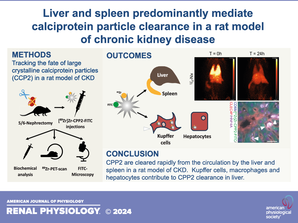 Calciprotein particles (CPPs) provide an efficient mineral buffering system to prevent the complexation of phosphate and calcium in the circulation. However, in chronic kidney disease (CKD), the phosphate load exceeds the mineral buffering capacity, resulting in the formation of crystalline CPP2 particles. CPP2 have been associated with cardiovascular events and mortality. Moreover, CPP2 have been demonstrated to induce calcification in vitro. In this study, we examined the fate of CPP2 in a rat model of CKD. Calcification was induced in Sprague-Dawley rats by 5/6 nephrectomy (5/6-Nx) combined with a high-phosphate diet. Control rats received sham surgery and high-phosphate diet. Twelve weeks after surgery, kidney failure was significantly induced in 5/6-Nx rats as determined by enhanced creatinine and urea plasma levels and abnormal kidney histological architecture. Subsequently, radioactive and fluorescent (FITC)-labeled CPP2 ([89Zr]Zr-CPP2-FITC) were injected intravenously to determine clearance in vivo. Using positron emission tomography scans and radioactive biodistribution measurements, it was demonstrated that [89Zr]Zr-CPP2-FITC are mainly present in the liver and spleen in both 5/6-Nx and sham rats. Immunohistochemistry showed that [89Zr]Zr-CPP2-FITC are predominantly taken up by Kupffer cells and macrophages. However, [89Zr]Zr-CPP2-FITC could also be detected in hepatocytes. In the different parts of the aorta and in the blood, low values of [89Zr]Zr-CPP2-FITC were detectable, independent of the presence of calcification. CPP2 are cleared rapidly from the circulation by the liver and spleen in a rat model of CKD. In the liver, Kupffer cells, macrophages, and hepatocytes contribute to CPP2 clearance.