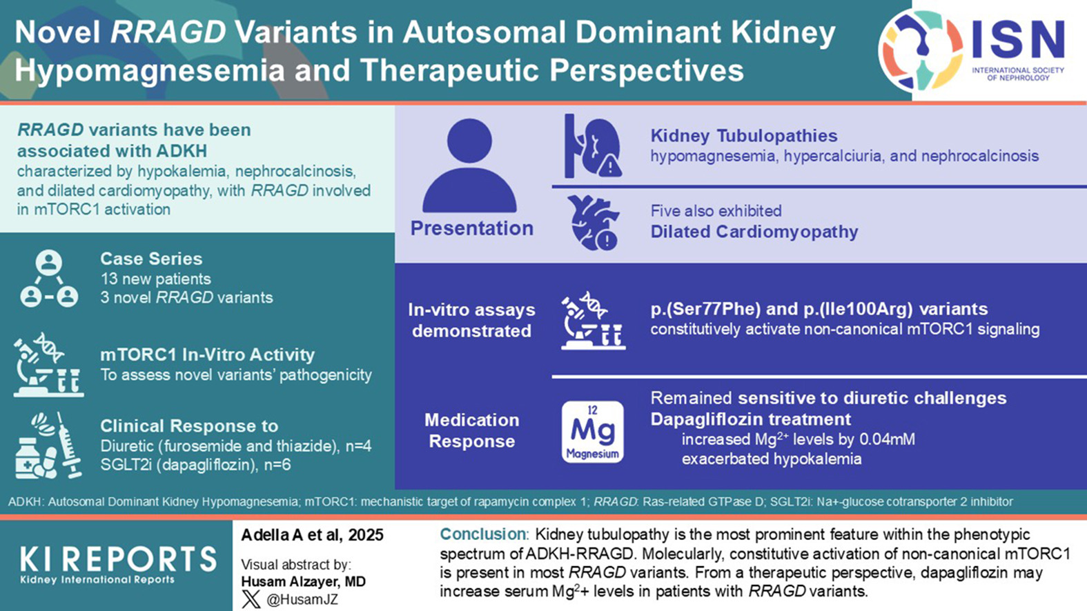 Conclusion: To date, 37 patients with ADKH-RRAGD have been identified. Kidney tubulopathy is the most prominent feature within the phenotypic spectrum of ADKH-RRAGD. Molecularly, constitutive activation of noncanonical mTORC1 is present in most RRAGD variants. From a therapeutic perspective, dapagliflozin may increase serum Mg2+ levels in patients with RRAGD variants.