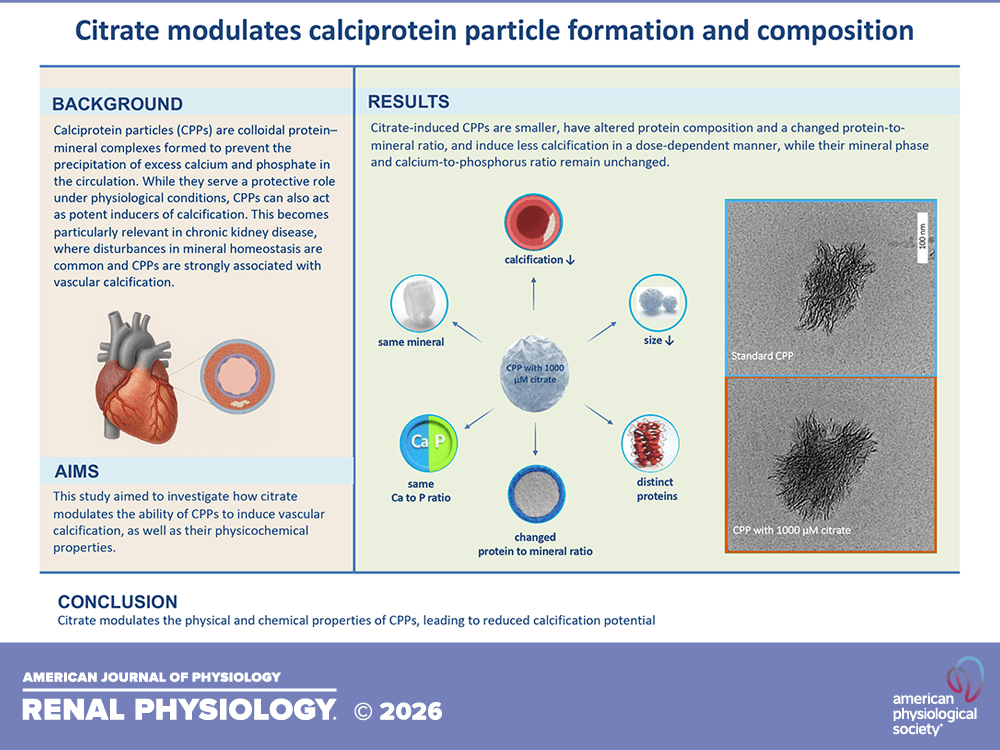 de La Roij G, van der Meijden RHM, Rutten L, Hoogstraten CA, Hinnen M, Martens S, Hoenderop JGJ, de Baaij JHF. Citrate modulates calciprotein particle formation and composition. Am J Physiol Renal Physiol. 2026 Mar 1;330(3):F313-F325.